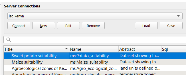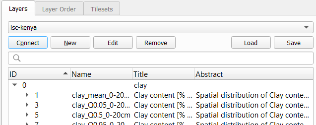 With the service selected, click the connect button and the layers available in the service are displayed