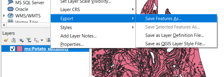 OGC:WFS retrieves vector features from a dataset. OGCAPI:Features is a modern alternative to WFS, supported by some servers. Adding a WFS or Features layer to QGIS uses a similar procedure as adding a WMS layer. Select Layer > Add layer > Add WFS layer from the menu. Notice that only vector layers are shown, grid layers use the WCS protocol (see next paragraph).